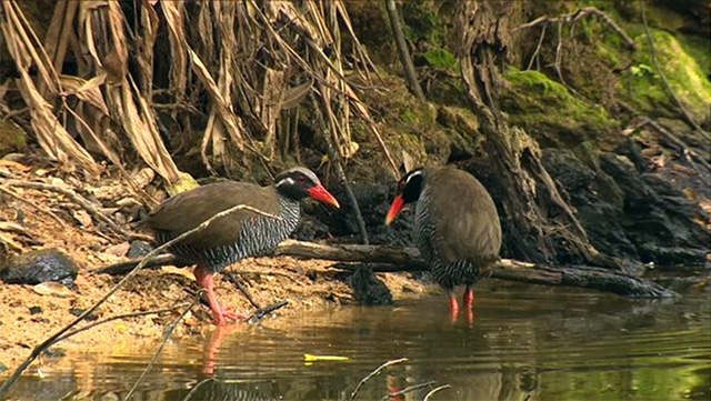ヤンバルクイナのテリトリーは約400m四方と言われています。 しかし、この周囲200m余りの池には少なくとも3ファミリーのヤンバルクイナが姿を現します。 この2羽のヤンバルクイナは、一方がもう1羽を突いて追い払っています。 テリトリーを侵害してしまったからでしょうか? それとも、単なる夫婦喧嘩なのでしょうか?