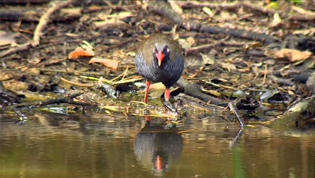 ヤンバルクイナは、漢字で書くと山原水鶏。 脚に水かきはありませんが、器用に泳ぎます。 しかし、水場にやって来ても、あまり積極的に泳ぐことはありません。 このように、浅い場所を選んで歩くのです。 飛ぶよりも泳ぐよりも歩くのが好きなヤンバルクイナなのです。