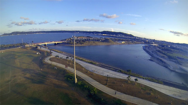 しかし強い南風に煽られて、常に水平線が傾いた状態になります。 強風もそうですが、このような海に囲まれたオープンな空間で飛ばすのは初めてのために、本当に戻ってくるのかが心配でなりません。 ホバリング状態でも、見る見るうちに風に流されて行きます。 バッテリーの持つ時間内に、離陸地点へ戻せるのかが不安になります。 しかし、想像以上にパワフルな飛行能力のお陰で、杞憂に終わりました。 是非、滞在中に風の穏やかな快晴を望みたいところです。