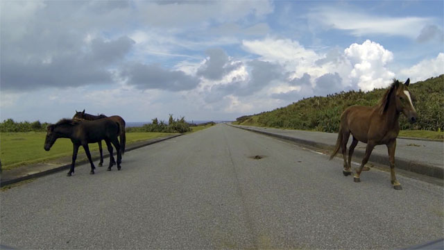 与那国島の平坦で広大な風景は、何処か北海道に通じるところもあります。 面積27.5㎢の小さな島なのに、不思議なことです。 島の中には、3カ所の大きな牧場があり、ヨナグニウマが放牧されています。 その中を一般道が走っていて、正に長閑な風景そのものです。